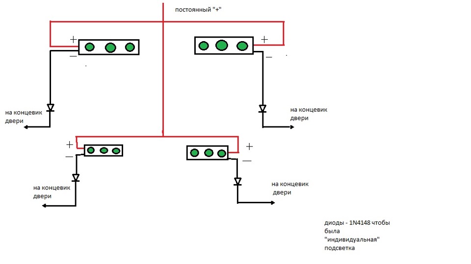 With this variant of installation tuning of the foot area will be turned on every time the doors are opened, as well as at the time of turning on the interior lighting. The installation itself follows the following algorithm: