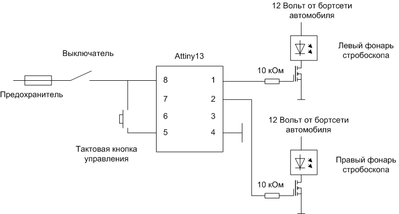 The picture shows an example of a circuit on the Attiny13. Please note that the connection of external elements to the chip pins can be different - the pin assignment is chosen programmatically.