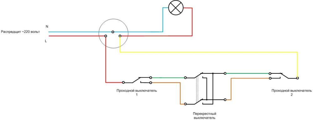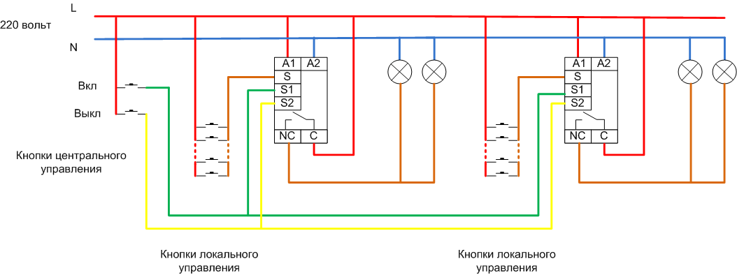 Another circuit option is to use priority inputs to turn on or off. This principle is used when it is necessary to provide centralized control of lighting of several rooms or zones. When you manipulate the central control buttons, the state of the lamps will not depend on the previous position - all the lights can be turned on or off at the same time. Such two-channel switching allows you to turn on or off the lights in all rooms at once from one place, and then control the lights from the local buttons.