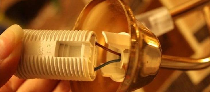 - Changing the socket in the lamp is not difficult, the work is carried out in reverse order. First, wires are connected to the new unit, this is done with terminals or clamp screws with plates, the main thing is to avoid contact of wires and their short circuit. Then the socket is put in place and fixed. Then you can put the lamps and connect the chandelier to the wiring, pre-hanging it on the ceiling.