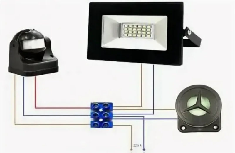 The output contact group of the detector serves as a power switch for the spotlight. But you can't connect the sensor with two wires - most sensors need 220 volts power (except for battery-powered devices). Therefore, you will have to pull three conductive wires to the motion detector: