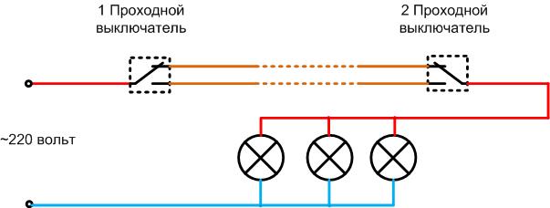 If you need a control circuit of three or more places, it is necessary to use cross apparatuses together with the marching switches. It is not possible to build such a system on pass-throughs alone. But if there are two two-way two-key devices, you can organize independent switching of two light sources from two different locations.