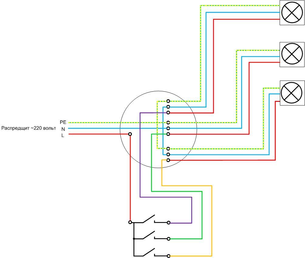 Important! For simplicity, the protective earth conductor PE is not shown in the diagram - it does not affect the functionality of the lighting system, but directly affects the safety. It comes from the switchboard to the lamp and is connected to the appropriate terminal.