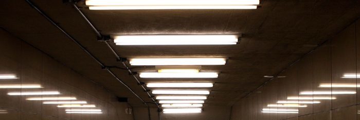 Fluorescent lamps consist of of a base, a ballast and a bulb with electrodes. Also in the bulb is an inert gas or mercury vapor, and the inner surface is covered with a phosphor. The phosphor converts ultraviolet radiation into visible light. This takes much less energy than a standard incandescent lamp (LL).