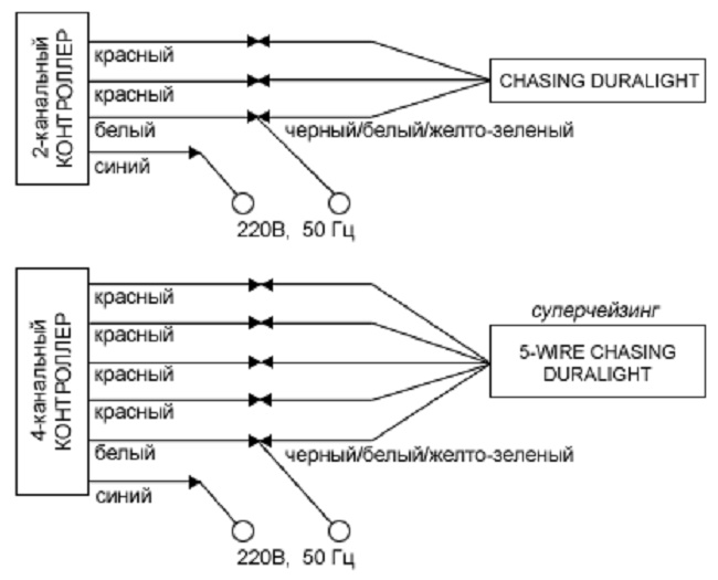 To make the diodes flicker, you need a controller. It is selected according to the power and the number of channels. The latter must coincide with the number of wires in the cord. Switching is made according to the rules: