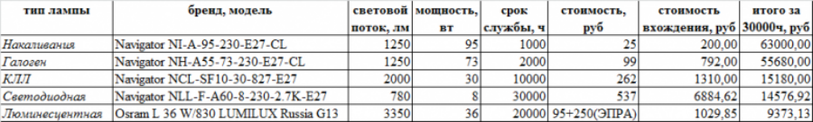 According to the specifications of specific models of lamps from one manufacturer it is possible to calculate the cost of lamp performance over a certain period of time. In the case of companies Navigator and Osram, the table of calculations is as follows.