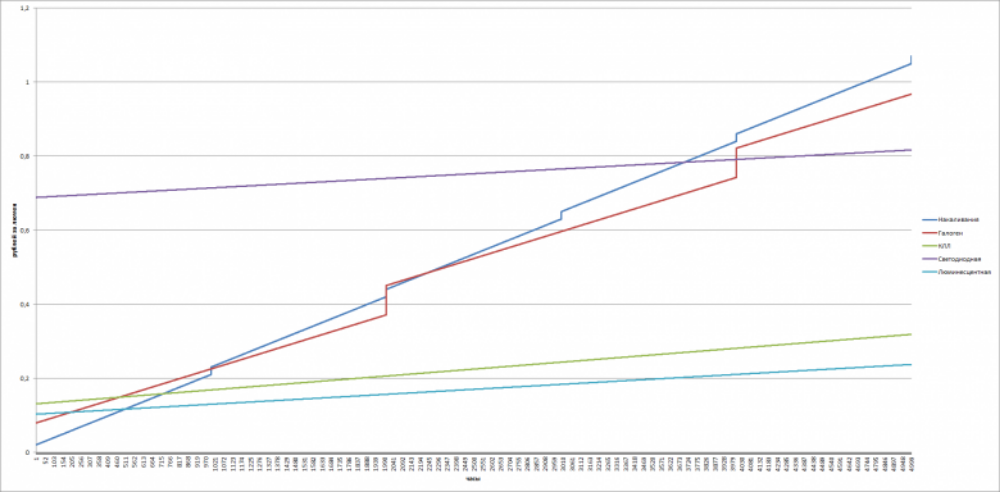 Based on the calculations, the most expensive of the presented devices - incandescent and halogen lamps. The cost of LEDs is comparable to gas-discharge economical lamps, but fluorescent lights, even with a capacity of 36 watts against 8 watts of LED-lamps, are cheaper. LED lamps begin to pay for themselves only after 4,000 hours, and become more profitable than energy-saving lamps after 25,000 hours of operation, as can be seen in the graph.