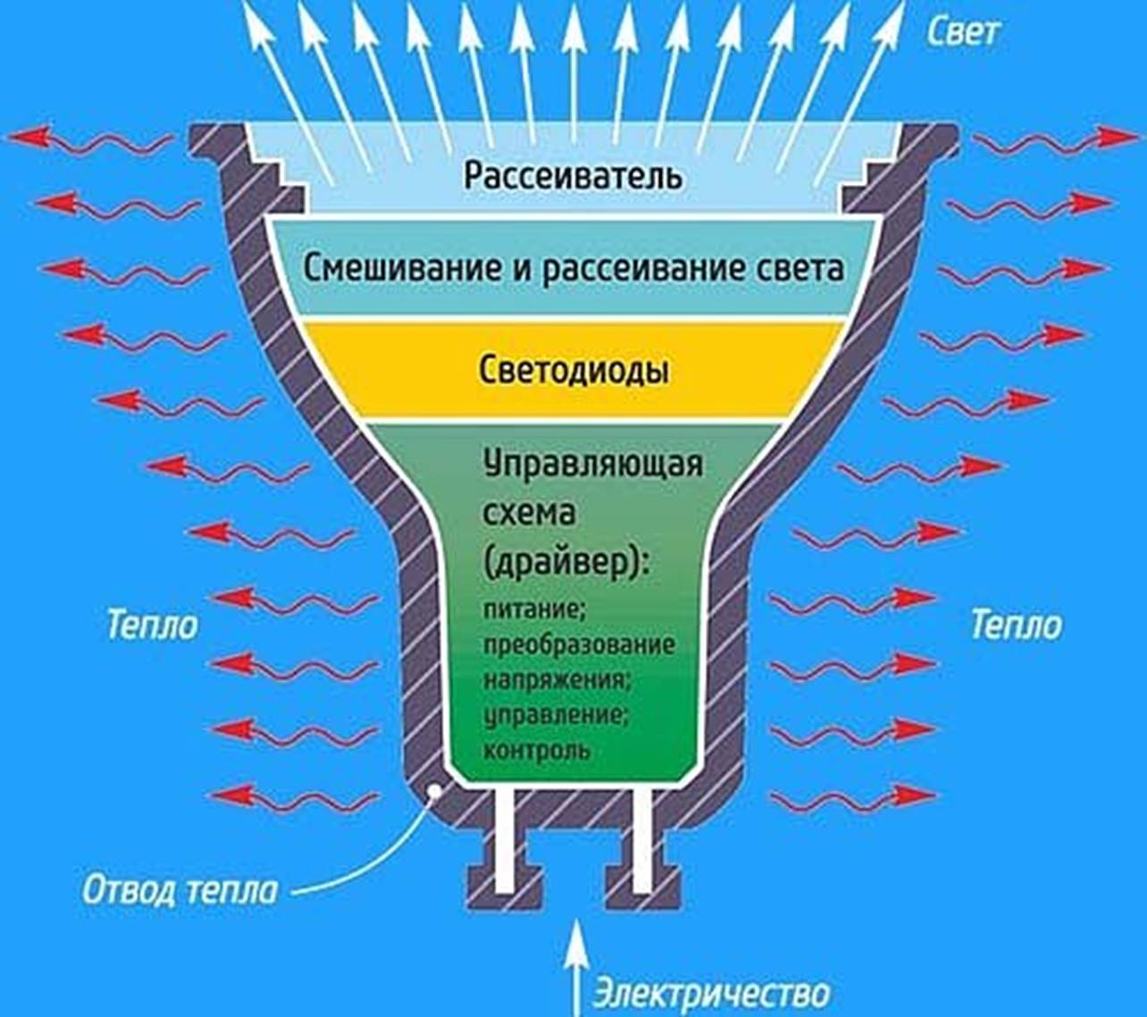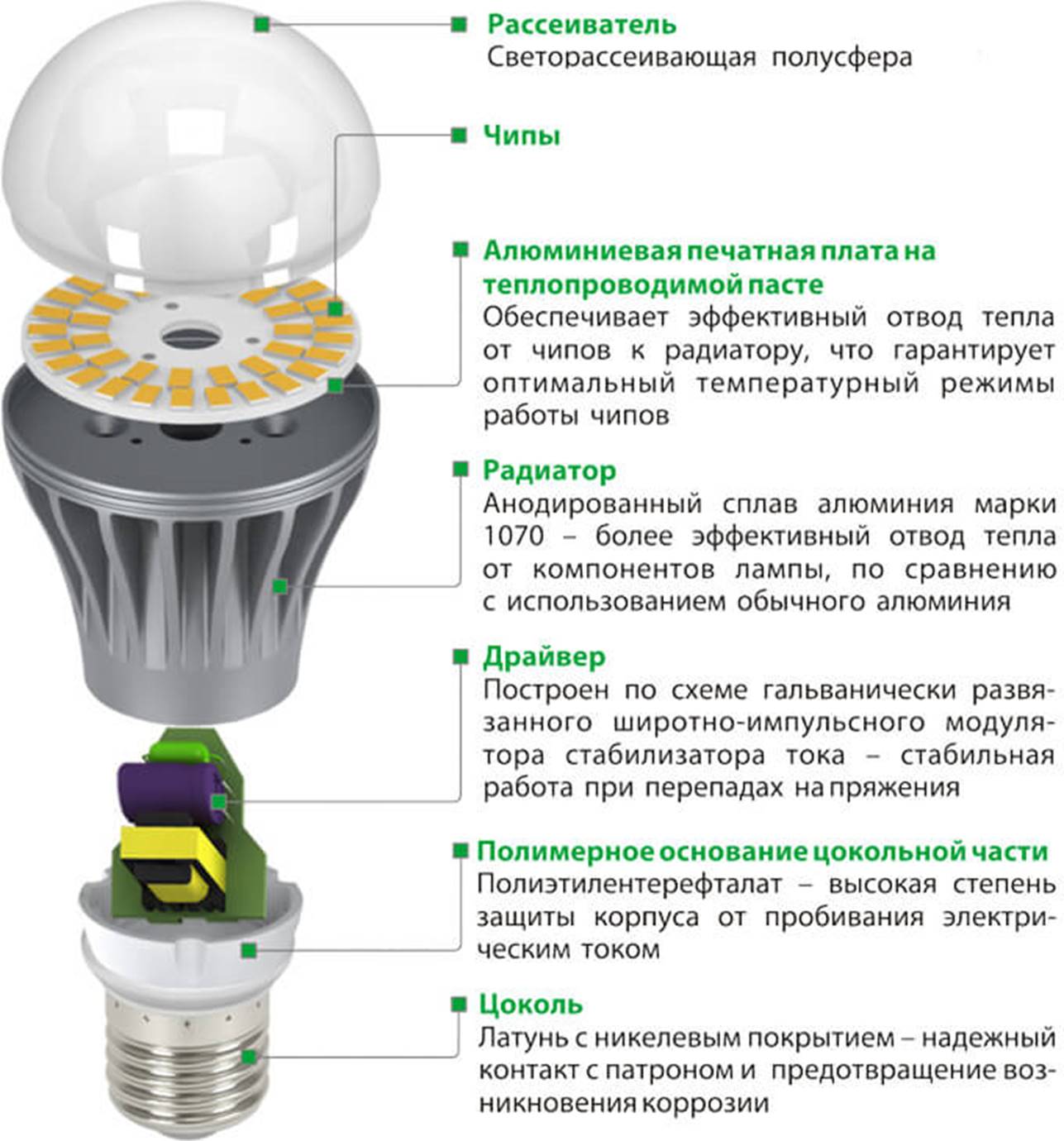 LED light bulb is a semiconductor element that converts the supply current into light. A special bulb (protective scattering glass) is made for the necessary dispersion and protection of diodes. Externally, the product resembles an ordinary incandescent lamp.