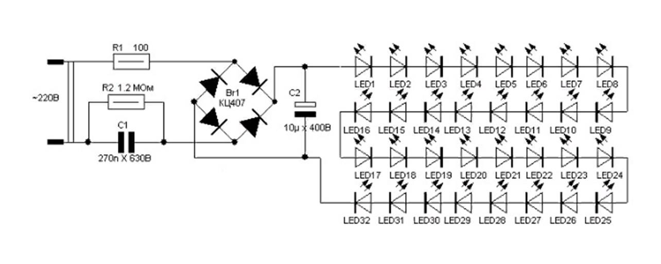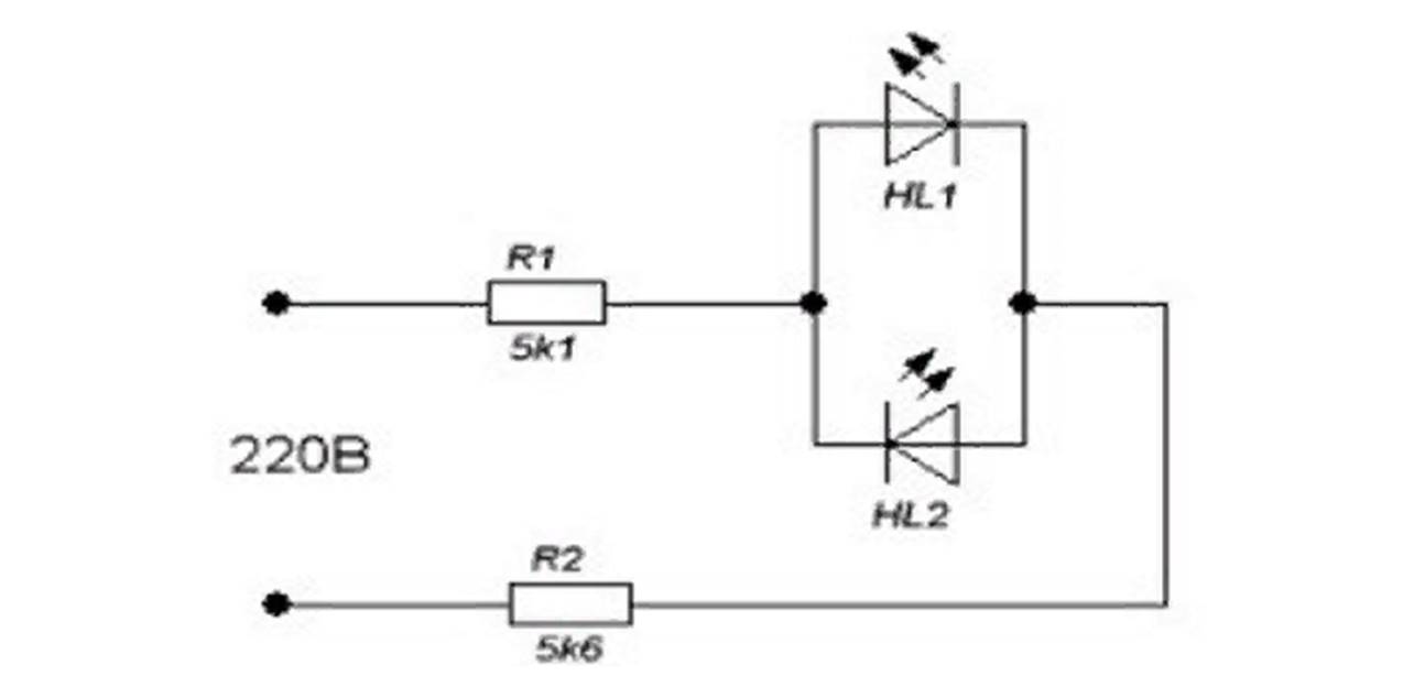 The schematic involves the use of only basic parts. There are 2 resistors, R1 and R2. To these diodes HL1 and HL2 are connected in counter-parallel. Such a device provides the circuit protection against reverse voltage overshoot. When turned on, the signal going to the lamp increases to 100 Hz. The voltage of 220 V is fed through C1 (limiting capacitor). From there it goes to the rectifier bridge and the chips.