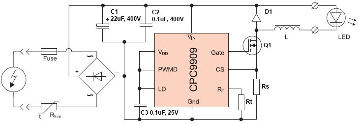 When compared to the linear driver, which uses a capacitor, the pulse driver is characterized by effective protection against instability in the mains. To look in detail at an example of a pulsed diode lamp circuit, we use the CPC9909. The efficiency of this product reaches 98%, so it can be considered without exaggeration one of the most economical and energy-saving.