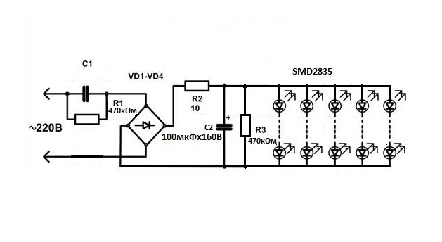 The capacitor C1 is needed to protect the device from mains noise. C4 will smooth out the ripple. When current is applied, resistors R3-R2 will limit it and protect the circuit from short circuits. The element VD1 converts the AC voltage. When the current flow stops, the capacitor will discharge through resistor R4. But elements R2-R3 are not used by all LED lighting manufacturers.