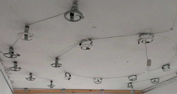 - Spotlights. are hidden under the surface of the ceiling, so they are suitable for wood panelling, plastic panels, drywall and stretch ceilings. There should be a void of at least 7 cm, so that the body fits and does not overheat when in operation. They look modern and concentrate light in a small area, you can put them every meter or more often, it all depends on the required level of lighting.