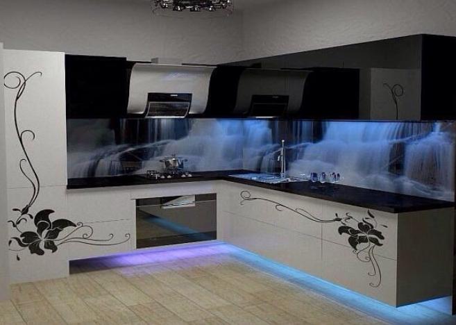 If the kitchen is equipped with cabinets with glass doors, a very effective decorative device would be their backlighting from the inside.