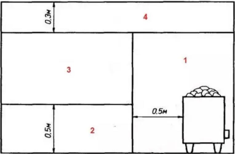 The first thing to remember is a simple rule: Lights in the steam room should not be placed on the ceiling. They are always mounted on the wall with a gap of at least 30 cm from the ceiling. And they have to be placed in the third zone, in the second zone you can only put a light fixture, it is easier to orient according to the scheme.