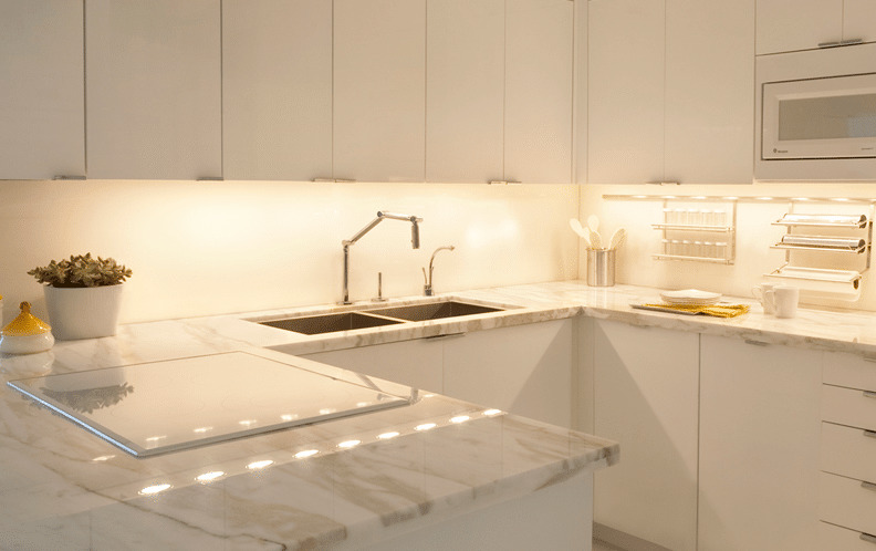 Typical applications for countertop illumination in the kitchen are spot or linear light fixtures.
