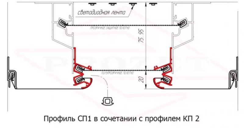 - SP1 - The universal type, which is used to create a light line, and for the docking of different canvases at one level or in the construction of multi-level systems. Typically, this element is attached to the profile KP2, which is located on the ceiling. The space between the two profiles is closed with translucent film to diffuse light, and the joint is decorated with an oval insert. In this case, the light line is always recessed into the surface, a small depression is not to everyone's liking.KP2 frame profile