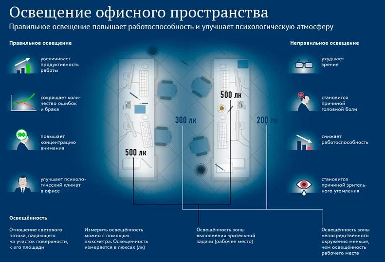 Office lighting is different from other places because it is a place where people do a lot of work that requires visual stress. All indicators are regulated by sanitary and hygienic standards, violations are not allowed. If the light does not meet the requirements, employees will get tired much faster and productivity will decrease.