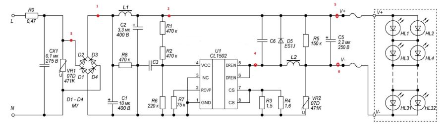 If you have an oscilloscope and are able to use it, further tests can be carried out. At point 4 there should be pulses. If there are no pulses, then the microcircuit is defective. If the pulses are present but there is no output voltage between points 5 and 6, you must check the elements of the power switch (first of all the elements D5, L2, C5).