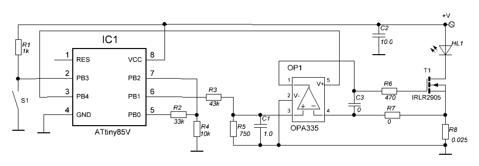 One of the variants of such device is when the control unit is made on a standard microcontroller (for example, ATtiny85), in which the control program of the emitter mode is written, the operational amplifier OPA335 serves as an intermediate and the field-effect transistor IRLR2905 is used as a key.