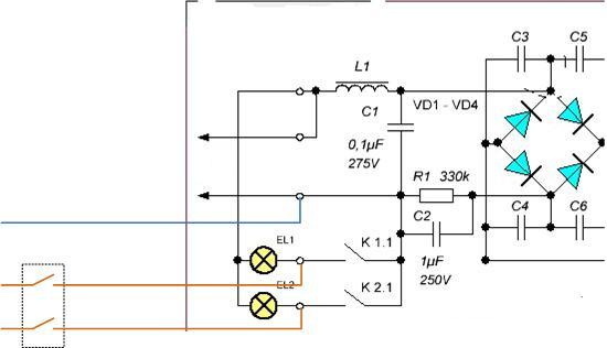 The work of the receiving and executive parts will be disassembled on the example of a typical circuit of a chandelier with two lamps. Other lighting devices are built on a similar principle.