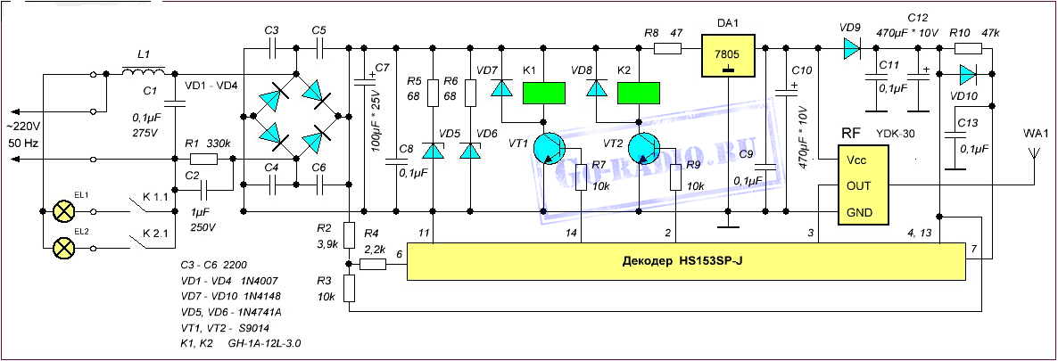 The YDK-30 module serves as a radio (RF) receiver. It converts the EMF induced in the antenna into a sequence of pulses with an amplitude sufficient to operate the decoder. The decoder is built on the HS153 chip. Upon receiving the command, the decoder turns the corresponding transistor key on or off. This key in turn controls an electromagnetic relay which gives voltage to the corresponding luminaire. The luminaires are built on LED or halogen bulbs with the appropriate driver or electronic control gear.