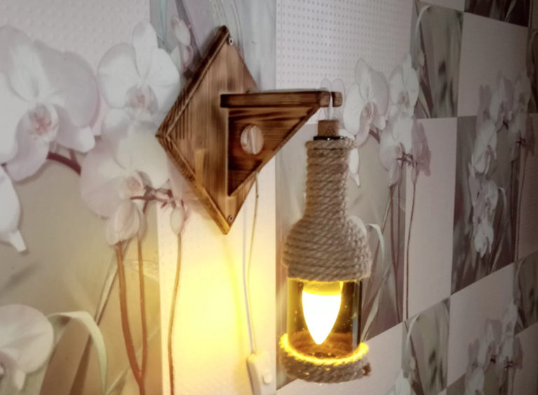 Glass is difficult to work with, but you can create interesting compositions from improvised glass materials. This can be a composition of bottles, pendants with cans. These elements can also become the basis for table lamps.