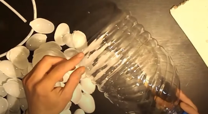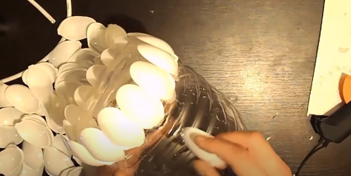 - You need to remove the labels from the bottle, cut off the bottom. Next, starting from the bottom up, glue the petals from the spoons.