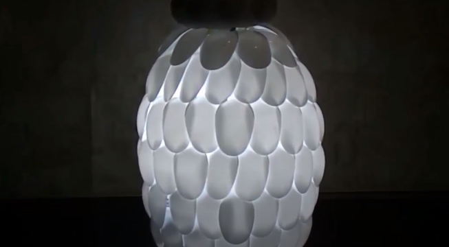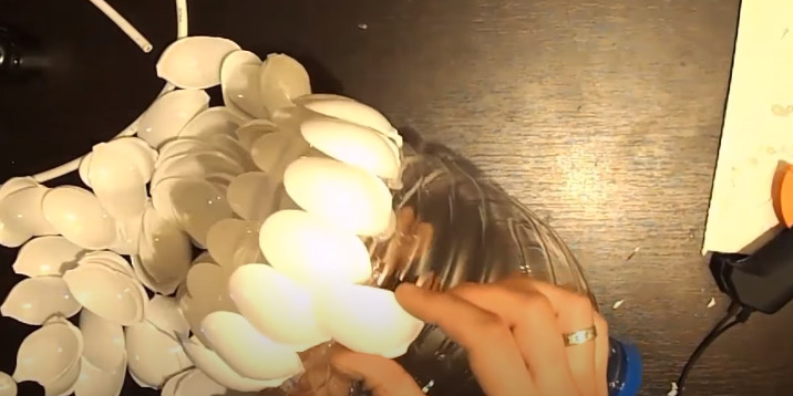 Almost any kind of plastic for homemade lights can be suitable: disposable dishes, water pipes, children's toys. One of the easiest ways with beautiful results is to use a bottle and disposable spoons. The result is a construction that looks something like a cone.