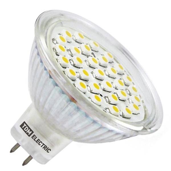 The two-inch multifaceted reflector of the MR16 lamp disperses the light in individual beams or in a general flux in a certain direction. The design was originally developed for overhead projectors, but later found use in studio and home lighting. It is most often equipped with 12 V halogen bulbs of 20-40 W or LED bulbs of 6, 12, or 24 W. The MR16 variant for spotlights has a GU 5.3 pin base with a pin spacing of 5.3 mm.
