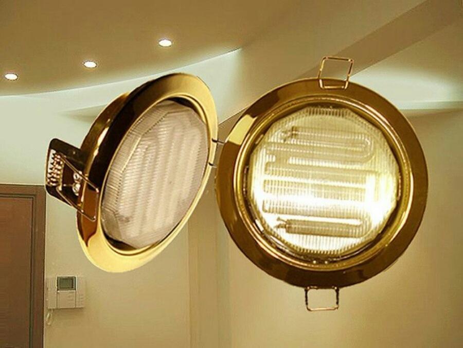 Gas discharge light sources are rarely used for spot lighting, because of their compactness associated with low power. Their principle of operation implies the presence in the lighting circuit of a ballast, usually starting a group of several fluorescent bulbs at once. There are samples with built-in ECG, but its dimensions increase the distance between the main ceiling and the suspended ceiling.