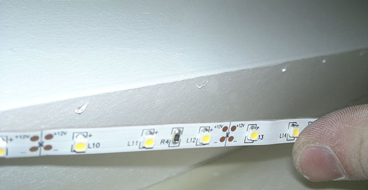 The next step is to proceed to LED strip installation. Here you will need construction adhesive, applied to the back surface of the tape. It is important to make a thorough cleaning of the surface on which the tape will be installed. If this is not done, over time it will fall off. When the adhesive is fully applied, the tape should be applied and secured by applying light pressure. The remains of the composition can be removed with an ordinary rag.