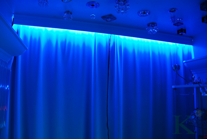 To create a very unusual effect, sometimes not the entire curtain, but only the lambrequin is illuminated. Such a solution will provide the room a special magical aura. Also LED lighting is not necessary to be hidden in a box. This option is used to illuminate the blinds. In this case, the tape is used with a dense arrangement of diodes.