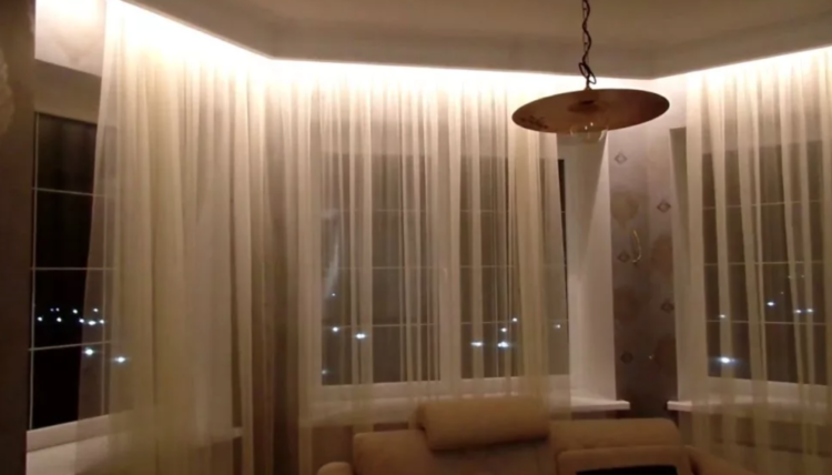 It is considered that the backlight is properly installed if the LEDs themselves are invisible and only the light that comes from them is visible. For such curtains, it is recommended to hide the ledge in the ceiling niche. If this option is not suitable, the source of light is hidden special cornice of polyurethane.