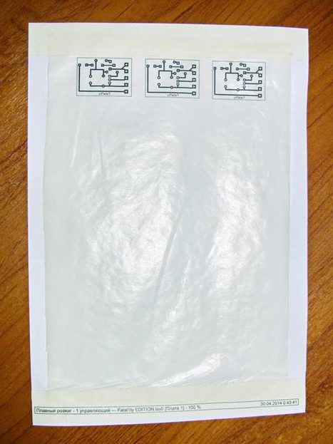 The circuit is glued to the sheet by heating it with an iron. To cool the board, it should be placed in cold water for a few minutes, and then remove the paper. If it does not peel right away, you need to peel it off gradually.