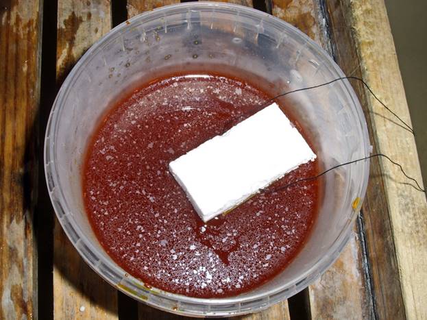Use double-sided tape to stick the board to a foam board of the same size and place it in a chloride iron solution for 5-7 minutes. In order not to keep the board too long, you should periodically take it out and check its condition. To speed up the etching process you can jiggle the container with the liquid. When the excess copper is drained off, the board should be rinsed in water.