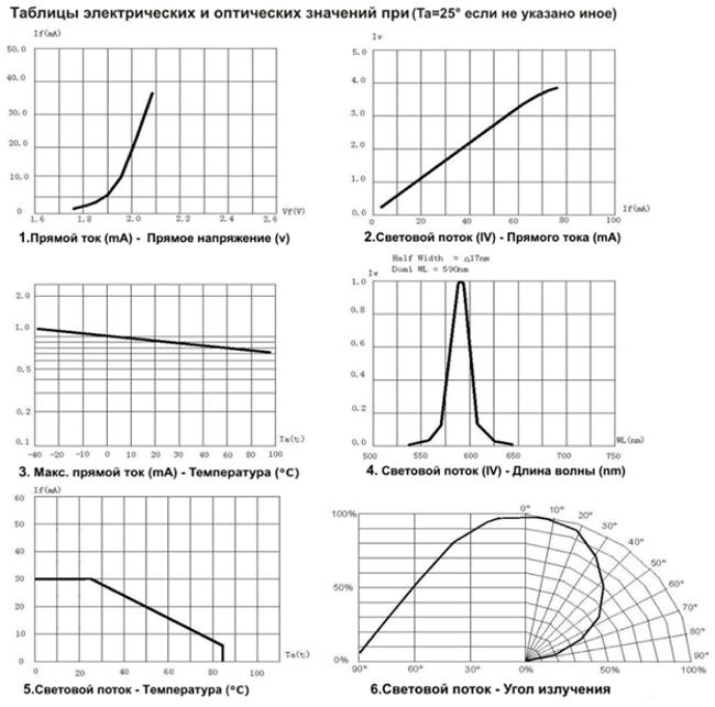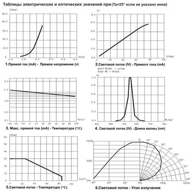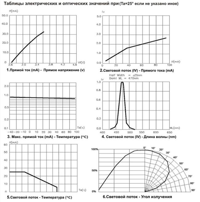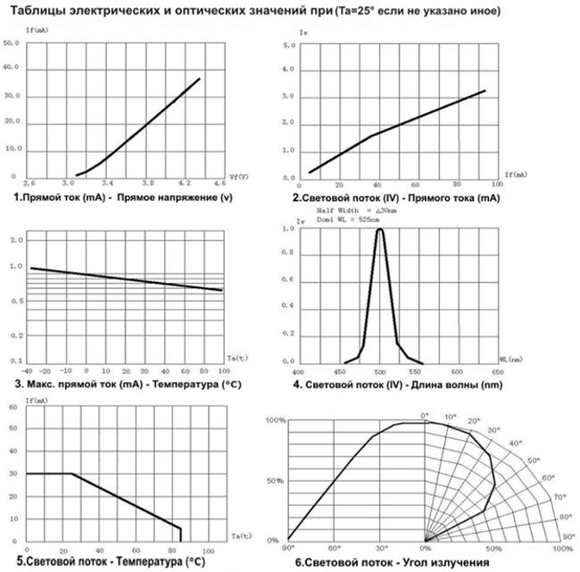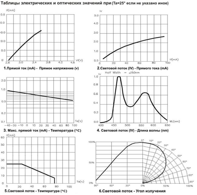Listed below are technical specifications of SMD 3528 LEDs with different color ranges. For convenience, there are graphs of operating values.
