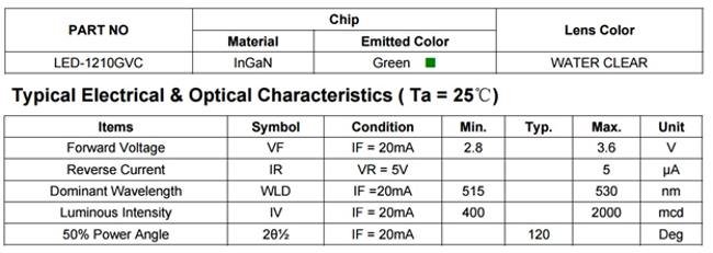 Specifications green LED: